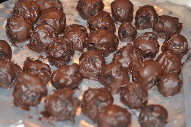 Last, we rolled the Oreo/cream cheese balls into the chocolate. It was too hot in the pot so we spooned the chocolate onto a plate before rolling each ball in it. When we finished we put all the truffles into the fridge to firm up.